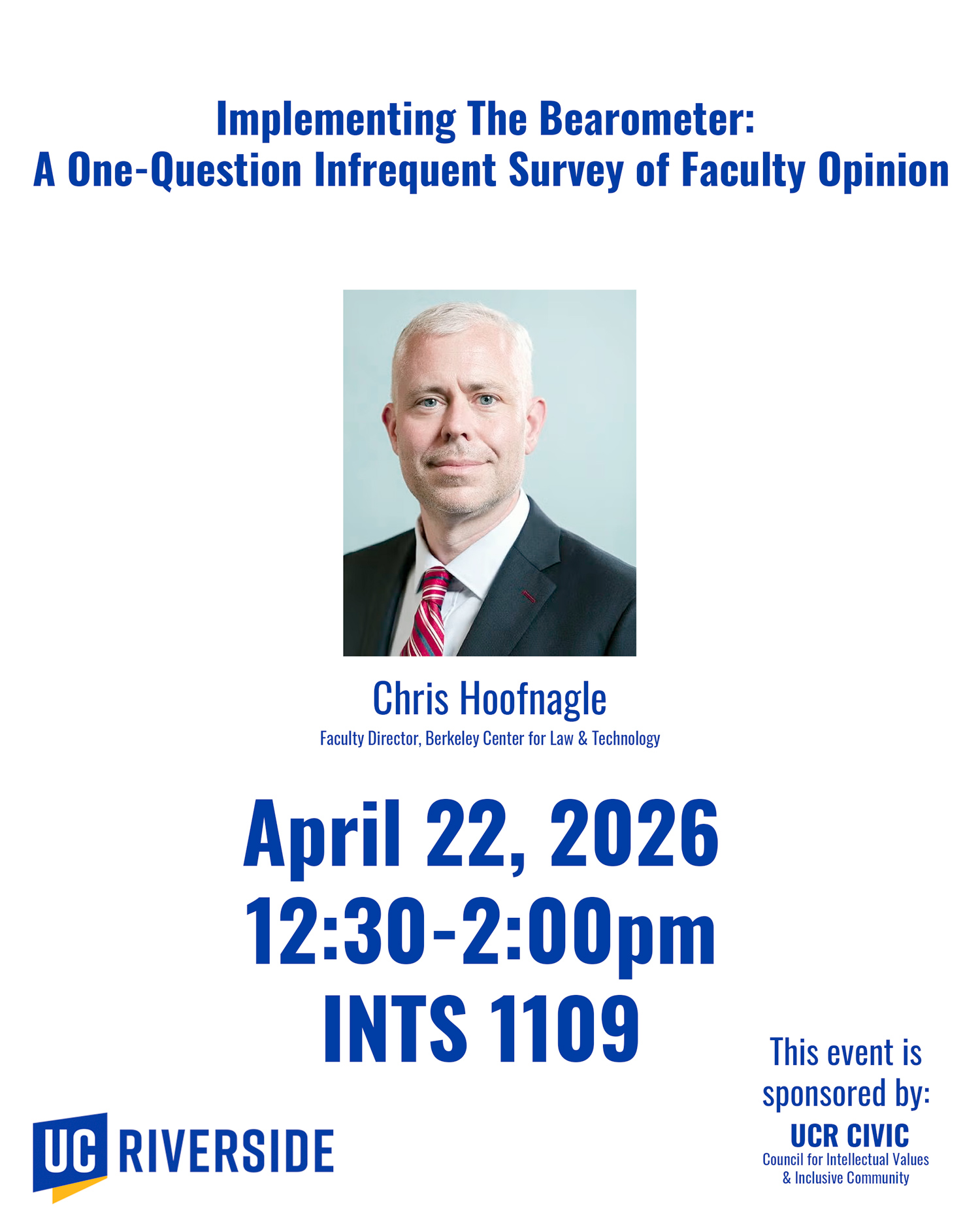 Inaugural Meeting – February 9th, 5:00-6:30pm, The Stable at The Barn. The UC Riverside Campus Community, the Council on Intellectual Values and Inclusive Community (CIVIC), held its first meeting Thursday evening, February 9th, 2023 with 20 attending in person or online. Another 12 have expressed interest but could not attend because of travel or prior obligations. These numbers exceeded our expectations. Colleagues from Art, Art History, Comparative Literature, History, Music, Philosophy, Physics, Political Science, Psychology, Public Policy, and Sociology attended. In the meeting, we discussed participants’ experiences with the culture of discourse on campus, campus practices we would like to address, and spring programming ideas. The discussion was lively and informative. Many said they appreciated the sense of community the group offered. Our next meeting will be held in early March.